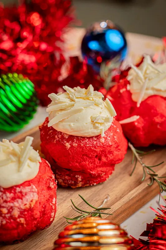 🎄 Chou de Navidad Relleno de una suave crema de frutos rojos y una cremosa mezcla de chocolate blanco infusionado con romero. Un bocado festivo, aromático y perfecto para diciembre.